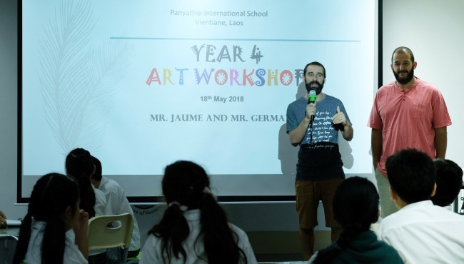 Ens ha sorprès molt com ens han tractat des de l’Escola, ja que fins i tot una furgoneta oficial ens ha vingut a buscar. Només arribar ja ho tenen tot preparat, una gran sala amb el projector i les 12 taules que necessitem per a cada grup dels 61 alumnes de Year 4, una fotògrafa per capturar els millors moments, l’esmorzar, el dinar, postals d’agraïment fetes pels mateixos alumnes i un sobre amb propina extra! No tenim paraules. Només podem donar les gràcies i treballar el millor que poguem durant el cap de setmana per tenir el conte finalitzat de cara a la presentació que farem el dilluns que ve. Ara toca treballar de valent i aprofitar les estones lliures per visitar la capital de Laos i per gaudir de la piscina de l’hotel.